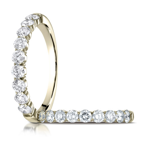 14kt yellow gold shared prong diamond band features nine round ideal cut diamonds. Total approximate carat weight is .72 ct. Diamond color G, clarity SI1. Standard fit. Width: 3.0mm. Thickness: 1.8mm. Made in USA.