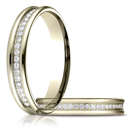 14kt yellow gold channel set diamond band features 28 round ideal cut diamonds. Total approximate carat weight is .28 ct. Diamond color G, clarity SI1. Comfort fit. Width: 5.5mm. Thickness: 1.8mm. Made in USA.