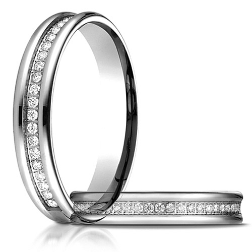 14kt white gold channel set diamond band features 28 round ideal cut diamonds. Total approximate carat weight is .28 ct. Diamond color G, clarity SI1. Comfort fit. Width: 5.5mm. Thickness: 1.8mm. Made in USA.