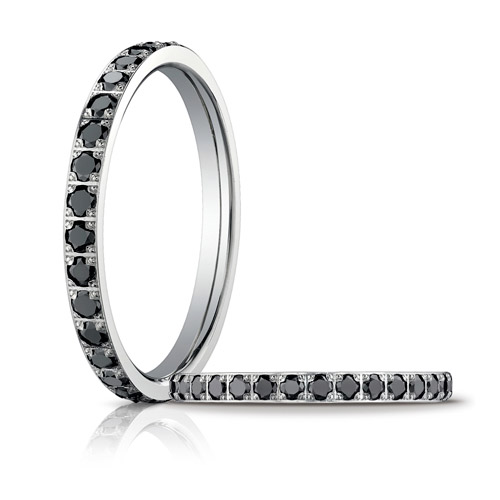 This 2/3 carat black diamond eternity band is made of 14kt white gold. 33 x .02CT round ideal-cut diamonds go all the way around the ring. Pavé set black diamonds are carefully matched and subject to stringent inspection. Width: 2mm. Die struck and standard fit. Made in USA.