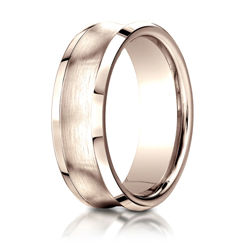 This 14kt rose gold wedding band has a satin finish concave center and polished edges. Die struck and comfort fit. Width: 7.5mm. Thickness: 1.9mm. Made in USA.Manufacturer's Lifetime GuaranteeIf your ring is ever damaged during normal wear, the manufacturer will repair or replace your wedding ring free of charge. If your finger size ever changes, the manufacturer will resize or replace your ring free of charge. In the case that the manufacturer has to add material to your ring, you will only be charged for the difference in the additional metal or stones needed to restore the piece. Guarantee ParametersThe guarantee does not cover rings that have been ordered in the wrong finger size or finger sizes that may have changed between the time of purchase and the actual physical receipt of the piece. Third party alterations, other than engraving, will void the warranty.Manufacturer reserves the right to deny the Lifetime Guarantee for any ring that shows signs of abuse or tampering.