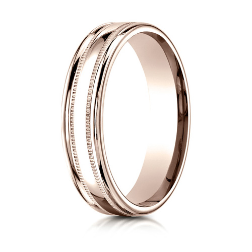 This 14kt rose gold wedding band has milgrain texture and polished rounded edges. Die struck and comfort fit. Width: 4mm. Thickness: 1.9mm. Made in USA.Manufacturer's Lifetime GuaranteeIf your ring is ever damaged during normal wear, the manufacturer will repair or replace your wedding ring free of charge. If your finger size ever changes, the manufacturer will resize or replace your ring free of charge. In the case that the manufacturer has to add material to your ring, you will only be charged for the difference in the additional metal or stones needed to restore the piece. Guarantee ParametersThe guarantee does not cover rings that have been ordered in the wrong finger size or finger sizes that may have changed between the time of purchase and the actual physical receipt of the piece. Third party alterations, other than engraving, will void the warranty.Manufacturer reserves the right to deny the Lifetime Guarantee for any ring that shows signs of abuse or tampering.