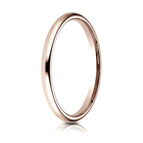 Slender 14k rose gold wedding band has a slightly domed center and polished finish. Die struck and comfort fit. Width: 2mm, thickness: 1.8mm. Made in USA. Available in finger sizes 4-15, whole and half sizes only.