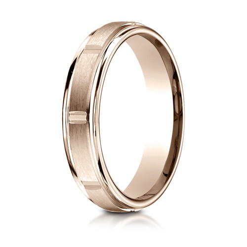This 14kt rose gold wedding band has a satin finish and eight polished vertical cuts. Polished rounded edges. Die struck and comfort fit. Width: 4mm. Thickness: 1.9mm. Made in USA.Manufacturer's Lifetime GuaranteeIf your ring is ever damaged during normal wear, the manufacturer will repair or replace your wedding ring free of charge. If your finger size ever changes, the manufacturer will resize or replace your ring free of charge. In the case that the manufacturer has to add material to your ring, you will only be charged for the difference in the additional metal or stones needed to restore the piece. Guarantee ParametersThe guarantee does not cover rings that have been ordered in the wrong finger size or finger sizes that may have changed between the time of purchase and the actual physical receipt of the piece. Third party alterations, other than engraving, will void the warranty.Manufacturer reserves the right to deny the Lifetime Guarantee for any ring that shows signs of abuse or tampering.