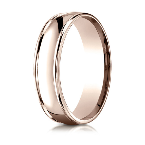 This 14kt rose gold wedding band has a polished finish and rounded edges. Die struck and comfort fit. Width: 6mm. Thickness: 1.9mm. Made in USA.Manufacturer's Lifetime GuaranteeIf your ring is ever damaged during normal wear, the manufacturer will repair or replace your wedding ring free of charge. If your finger size ever changes, the manufacturer will resize or replace your ring free of charge. In the case that the manufacturer has to add material to your ring, you will only be charged for the difference in the additional metal or stones needed to restore the piece. Guarantee ParametersThe guarantee does not cover rings that have been ordered in the wrong finger size or finger sizes that may have changed between the time of purchase and the actual physical receipt of the piece. Third party alterations, other than engraving, will void the warranty.Manufacturer reserves the right to deny the Lifetime Guarantee for any ring that shows signs of abuse or tampering.
