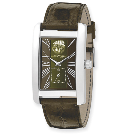 Learn more about this authentic men's Ed Hardy first class bulldog watch: Band: Genuine leather faux crocodile embossed Case: Custom 31mm X 48mm, 316L stainless steel Hardened mineral crystal Green and brown dial Silver-tone hands Roman numeral hour markers 2 hand quartz movement Water resistance to 5 ATM 2-Year manufacturer's warranty Includes Ed Hardy watch box