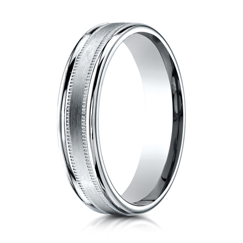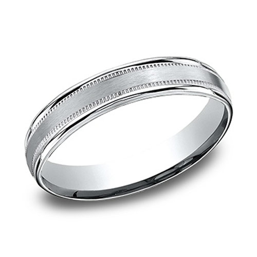 Die struck and comfort fit. Satin flat center with milgrain; polished rounded edges. Width: 4mm. Solid platinum 950 [95% Platinum, 5% Ruthenium alloy]. Made in the USA.