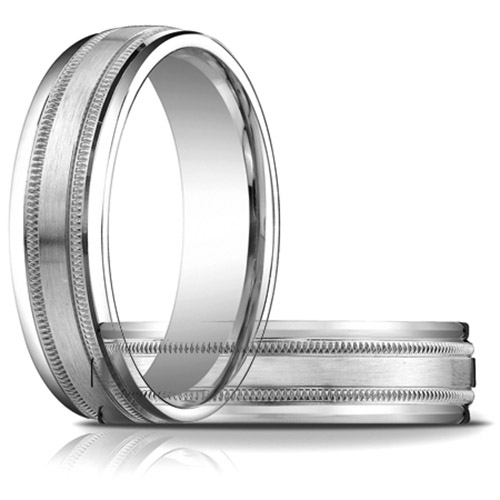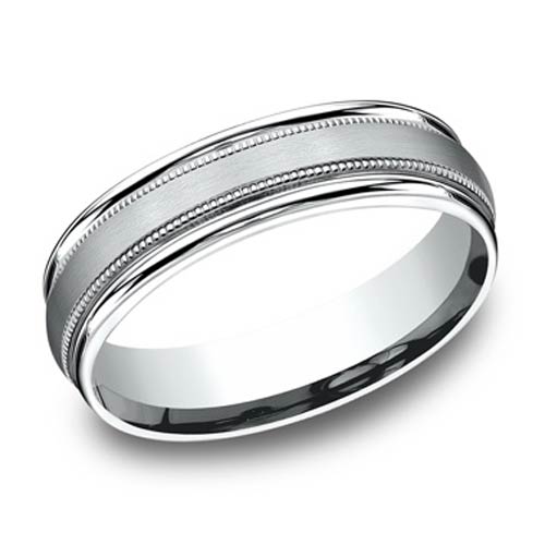 Platinum wedding band has a satin flat center with milgrain and polished rounded edges. Width: 6mm. Die struck and comfort fit. Solid platinum 950 [95% Platinum, 5% Ruthenium alloy]. Made in the USA.