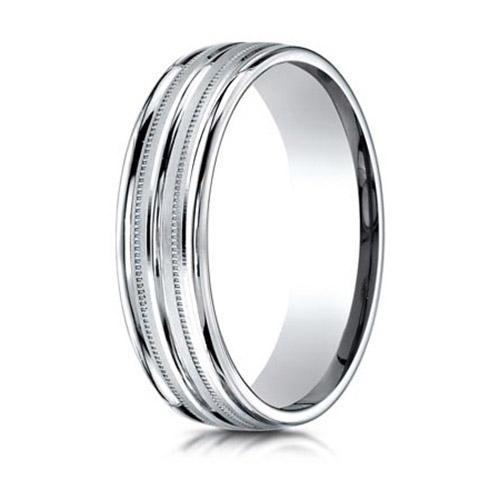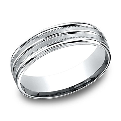 Platinum 6mm wedding band has a satin flat center with milgrain. Polished rounded edges. Die struck and comfort fit. Solid platinum 950 [95% Platinum, 5% Ruthenium alloy]. Made in the USA.