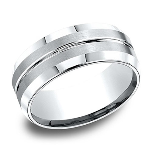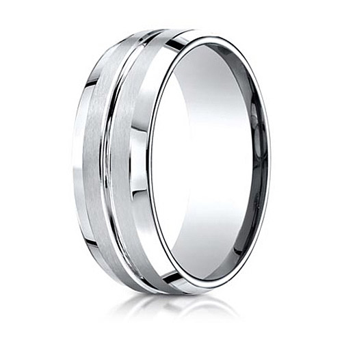 This men's wedding band has a satin finish center and polished groove. Die struck and comfort fit. Polished beveled edges. Width: 8mm. Solid platinum 950 [95% Platinum, 5% Ruthenium alloy]. Made in the USA.