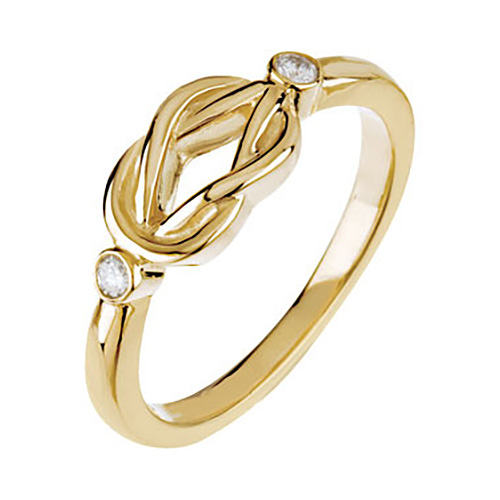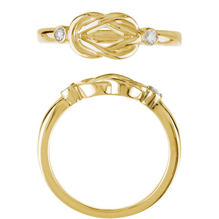 This magnificent ring features the timeless Hercules knot and two diamond bezel set accents. Polished 14kt yellow gold. Diamond details: .06 ct tw, 2 x 2.0mm full cut diamonds, I1 clarity, G-H color. Approximate item weight: 3.89 grams.