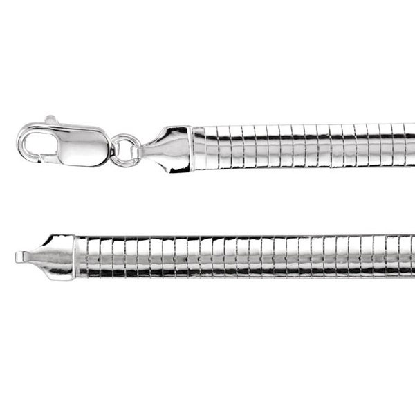 Solid sterling silver omega chain has a lobster clasp. Length: 16 inches. Domed profile. Width: 6mm. Approximate weight: 25.0 grams.