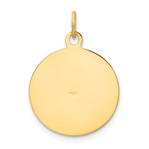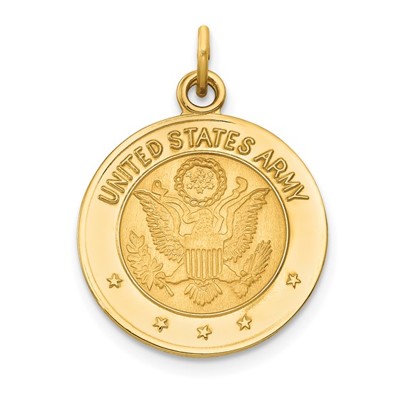 United States Army round pendant is made of solid 14kt yellow gold. Pendant measures 5/8 inch tall and 5/8 inch wide. This item weighs approximately 1.75 grams. Bail accommodates up to a 4mm wide chain. Chain sold separately. Army trademarks and insignias are reproduced with permission from the Department of the Army. Permission has been granted for use of the Marine Corps, Air Force, Coast Guard and Navy insignias on jewelry; however, usage does not indicate endorsement by the Department of Defense or any of its components.