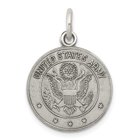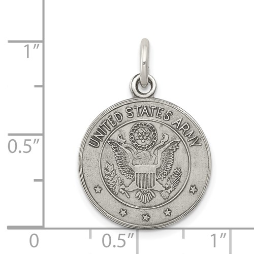 Solid sterling silver round pendant depicts the United States Army seal. Pendant measures 5/8 inch tall and 5/8 inch wide, slightly smaller than a dime. This item weighs approximately 2.14 grams. Chain sold separately. Army trademarks and insignias are reproduced with permission from the Department of the Army. Permission has been granted for use of the Marine Corps, Air Force, Coast Guard and Navy insignias on jewelry; however, usage does not indicate endorsement by the Department of Defense or any of its components.