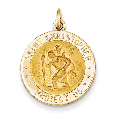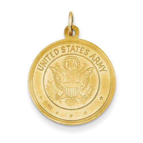 This reversible United States Army and St Christopher medal is made of solid 14k yellow gold. Saint Christopher Protect Us on one side, US Army Seal on the other. Pendant measures 5/8 inch tall and 5/8 inch wide, about the size of a dime. This item weighs approximately 2.4 grams. Bail accommodates up to a 3mm wide chain. Chain sold separately. Army trademarks and insignias are reproduced with permission from the Department of the Army. Permission has been granted for use of the Marine Corps, Air Force, Coast Guard and Navy insignias on jewelry; however, usage does not indicate endorsement by the Department of Defense or any of its components.