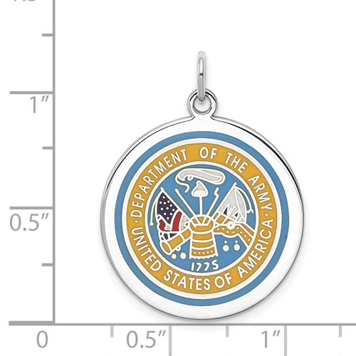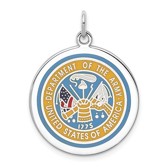 Solid sterling silver charm. Gold and blue enamel Department of the Army seal. Charm measures 7/8in x 7/8in. Bail accommodates up to a 3mm wide chain. Flat back. Chain sold separately. Army trademarks and insignias are reproduced with permission from the Department of the Army. Permission has been granted for use of the Marine Corps, Air Force, Coast Guard and Navy insignias on jewelry; however, usage does not indicate endorsement by the Department of Defense or any of its components.