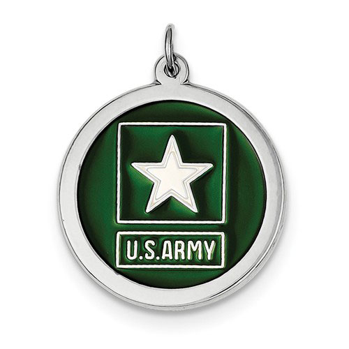 This round solid sterling silver charm has green enamel and the US Army star design. Charm measures 7/8in x 7/8in. Bail accommodates up to a 3mm wide chain. Flat back. Chain sold separately. Army trademarks and insignias are reproduced with permission from the Department of the Army. Permission has been granted for use of the Marine Corps, Air Force, Coast Guard and Navy insignias on jewelry; however, usage does not indicate endorsement by the Department of Defense or any of its components.