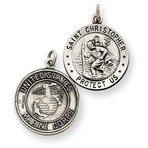 US Marine Corps and St Christopher medal is made of antiqued sterling silver. Item measures 3/4in x 3/4in, slightly larger than a penny. Jump ring accommodates up to a 3mm wide chain. This item weighs approximately 2.7 grams. Chain sold separately. Army trademarks and insignias are reproduced with permission from the Department of the Army. Permission has been granted for use of the Marine Corps, Air Force, Coast Guard and Navy insignias on jewelry; however, usage does not indicate endorsement by the Department of Defense or any of its components.