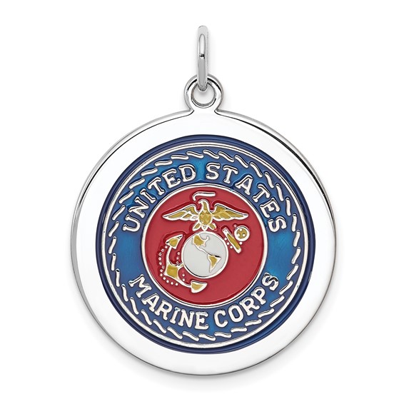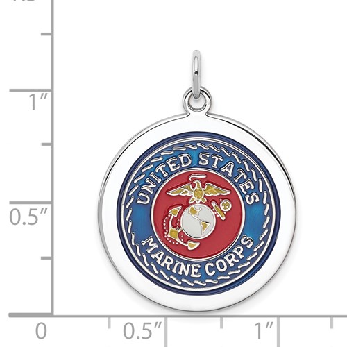 Red and blue enamel United States Marine Corps medal is made of polished sterling silver. Charm measures 7/8in x 7/8in. Bail fits up to a 3mm wide chain. Flat back. Made in the USA. Chain sold separately. Army trademarks and insignias are reproduced with permission from the Department of the Army. Permission has been granted for use of the Marine Corps, Air Force, Coast Guard and Navy insignias on jewelry; however, usage does not indicate endorsement by the Department of Defense or any of its components.