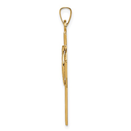 US Navy cross pendant is made of polished 14kt yellow gold. Pendant is 3/4in x 1 1/8in. Bail fits up to a 3mm wide chain. Open back. Chain sold separately. Permission has been granted for use of the Marine Corps, Air Force, Coast Guard and Navy insignias on jewelry; however, usage does not indicate endorsement by the Department of Defense or any of its components.