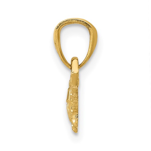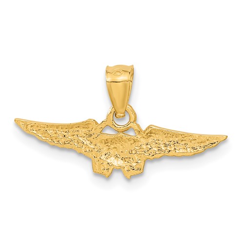 United States Navy flight officer pendant is made of polished solid 14k yellow gold. This item measures 7/8in x 1/4in and weighs 0.9 grams. Bail accommodates up to a 3mm wide chain. Officially licensed by the United States Navy. Permission has been granted for use of the Marine Corps, Air Force, Coast Guard and Navy insignias on jewelry; however, usage does not indicate endorsement by the Department of Defense or any of its components.
