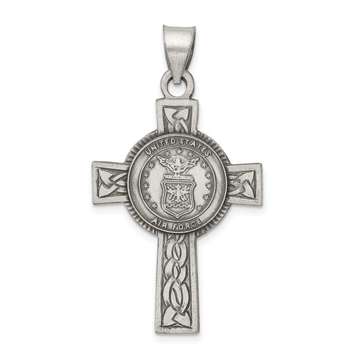 United States Air Force cross pendant is made of sterling silver. Pendant size: 1 1/4 inch tall and 3/4 inch wide. Fits up to a 3mm wide chain. This item weighs approximately 2.28 grams. Chain sold separately. Army trademarks and insignias are reproduced with permission from the Department of the Army. Permission has been granted for use of the Marine Corps, Air Force, Coast Guard and Navy insignias on jewelry; however, usage does not indicate endorsement by the Department of Defense or any of its components.