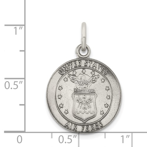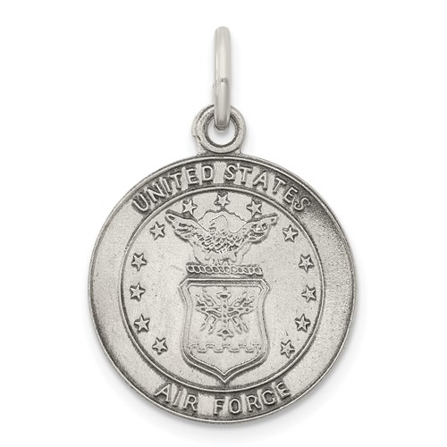 This round United States air force charm is made of antiqued sterling silver. Item size: 5/8 inch tall and 5/8 inch wide. This item weighs approximately 2.14 grams. Chain sold separately. Army trademarks and insignias are reproduced with permission from the Department of the Army. Permission has been granted for use of the Marine Corps, Air Force, Coast Guard and Navy insignias on jewelry; however, usage does not indicate endorsement by the Department of Defense or any of its components.