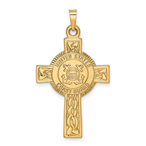 Solid 14k yellow gold cross pendant has the US Coast Guard insignia design in the center. Pendant measures 3/4in x 1 1/8in and weighs 2.17 grams. Bail accommodates up to a 3mm wide chain. Permission has been granted for use of the Coast Guard, Coast Guard and Coast Guard insignias on jewelry; however, usage does not indicate endorsement by the Department of Defense or any of its components.