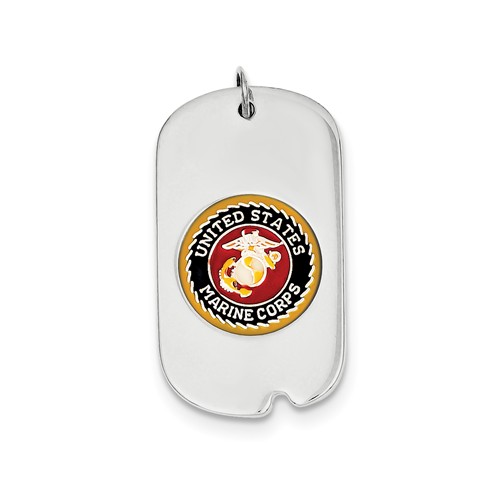 United States Marine Corps dog tag is made of enamel and polished sterling silver. Highly detailed, red and blue enamel eagle, globe and anchor emblem. This item measures 3/4in x 1 1/4in and weighs 5.5 grams. Bail accommodates up to a 3.5mm wide chain. Chain sold separately. Permission has been granted for use of the Marine Corps insignia on jewelry; however, usage does not indicate endorsement by the Department of Defense or any of its components. Made in USA.