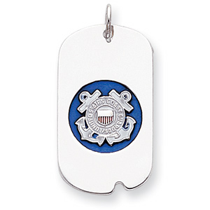 US Coast Guard dog tag is made of polished sterling silver. Highly detailed, blue enamel United States Coast Guard emblem. This item measures 3/4in x 1 1/4in and weighs 5.5 grams. Bail accommodates up to a 3.5mm wide chain. Chain sold separately. Engraved items are final sale. Army trademarks and insignias are reproduced with permission from the Department of the Army. Permission has been granted for use of the Coast Guard, Coast Guard, Coast Guard and Coast Guard insignias on jewelry; however, usage does not indicate endorsement by the Department of Defense or any of its components.