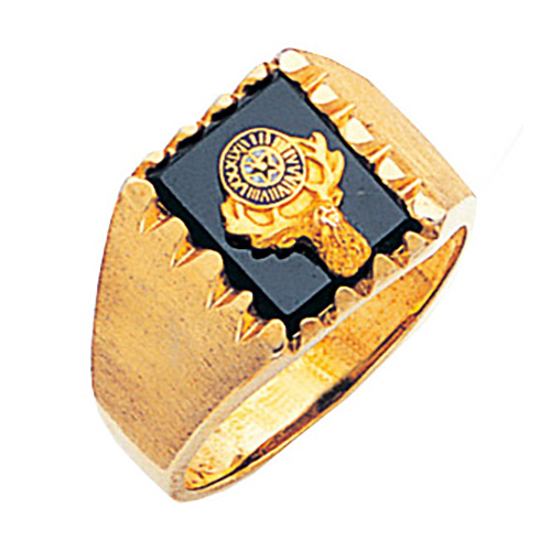 Elks ring is made of Solid, polished 10k yellow gold. This ring is 7/16 inch at the widest top measurement. Blank sides. Simulated rectangular onyx stone. Elk seal two tone emblem.