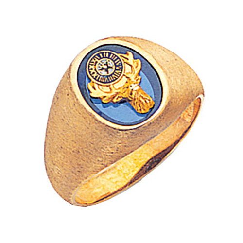 Solid polished 10k yellow gold Elk ring has blank sides and an open back. Simulated oval blue spinel stone. Benevolent and Protective Order of Elks insignia is on the top of the stone. Standard fit. Made in USA.