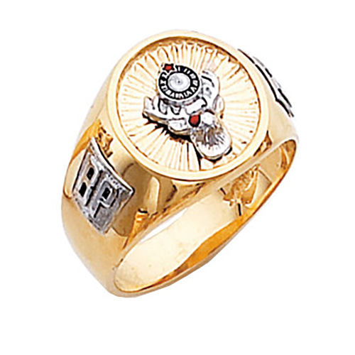 Harvey & Otis elk ring is made of polished 10k yellow and white gold. This ring is 7/16 inch at the widest top measurement. Finely detailed ring features white gold elk on signet style top, flanked with BP on the left and OE on the right. BPOE is an acroynm for The Benevolent & Protective Order of Elks. Available with solid back only. Also available in white gold by special order.