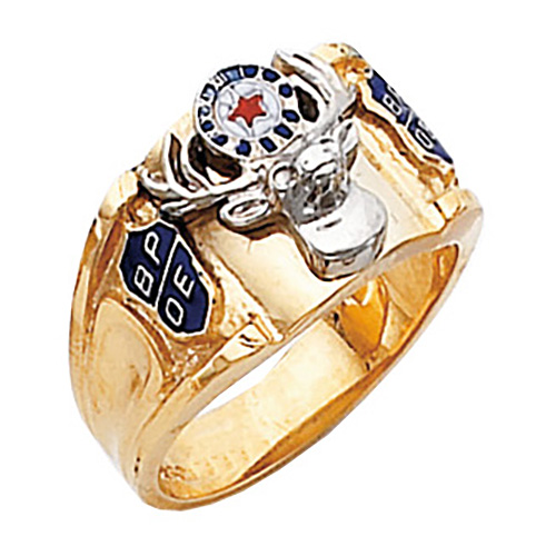 Polished 14kt yellow and white gold. This ring is 9/16 inch at the widest top measurement. Ornate ring features white gold elk on signet style top, flanked with blue enamel shields: BP on the left and OE on the right. BPOE is an acroynm for The Benevolent & Protective Order of Elks. Available with open or solid back. Also available in white gold by special order.
