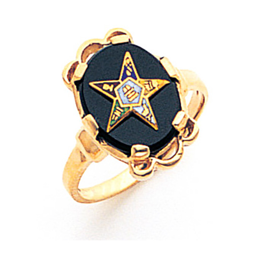 This order of the eastern star ring has a simulated oval black onyx stone and is made of polished 10k yellow gold. Full color OES logo is attached to the stone. Six prongs. Made in USA.
