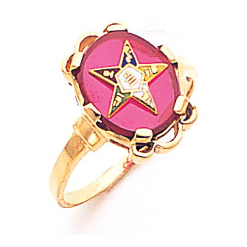 Polished 14k yellow gold. Finely detailed ring features Order of the Eastern Star logo on oval simulated red corundum stone. Secure six prong setting.