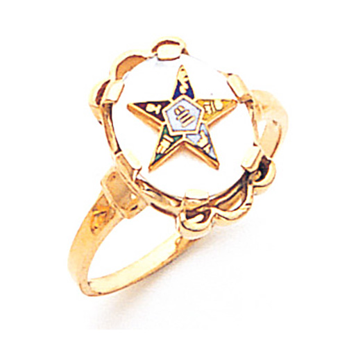 Order of the Eastern Star ring has an oval simulated mother of pearl stone. Handcrafted in 10k yellow gold. Full color OES logo. Six prongs. Made in the USA.