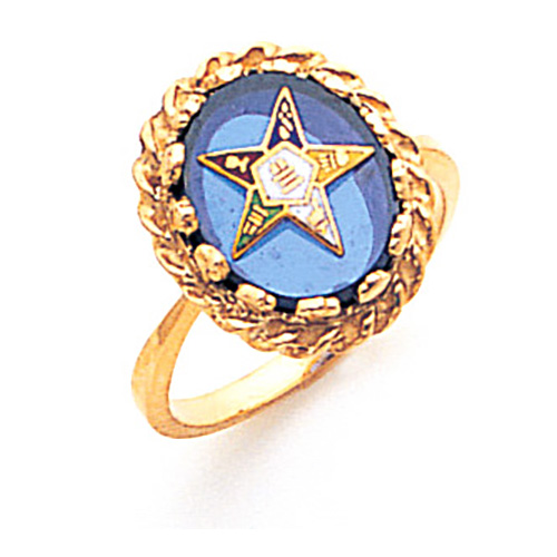 This 10k yellow gold Order of the Eastern Star ring has a simulated blue stone with decorative bezel. Full color Order of the Eastern Star logo. Made in USA.