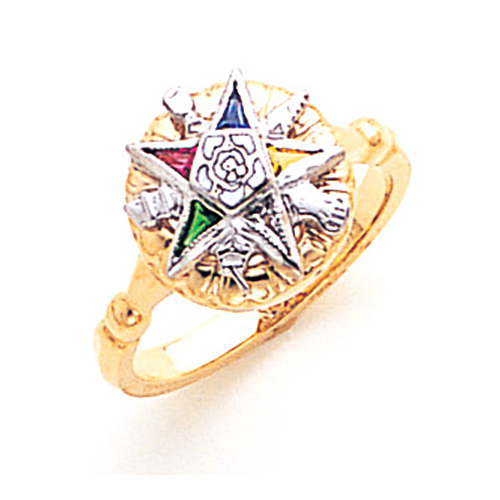 This Eastern Star ring has a round signet style top and is made of polished 10k yellow gold. Finely detailed ring features enamel Order of the Eastern Star logo with five implements between the points. Made in USA.