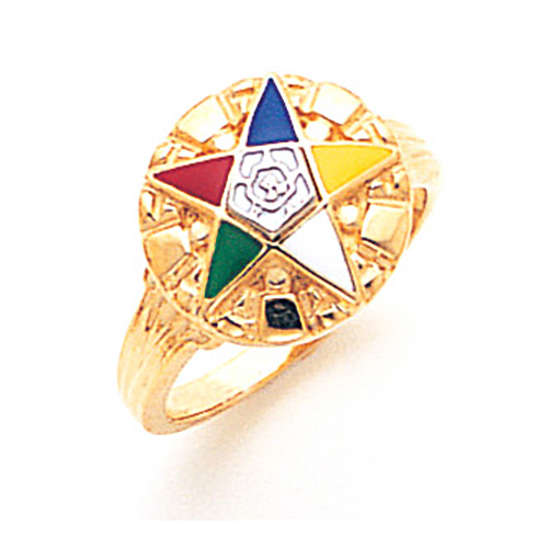 Polished 14k yellow gold. Finely detailed ring features enamel Order of the Eastern Star logo.