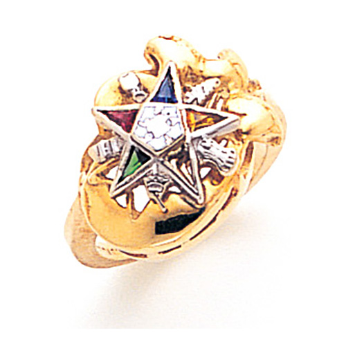This OES ring has an intricate top and is made to order in polished 14k yellow gold. Five-color Order of the Eastern Star logo is on top. Standard fit. Made in USA.