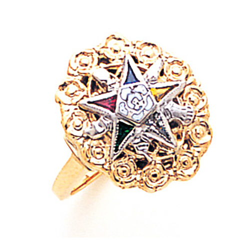 This OES ring has an oval shaped top with beaded texture and is made of polished 10k yellow gold. Five-color enamel Order of the Eastern Star logo is on top. Made in USA.