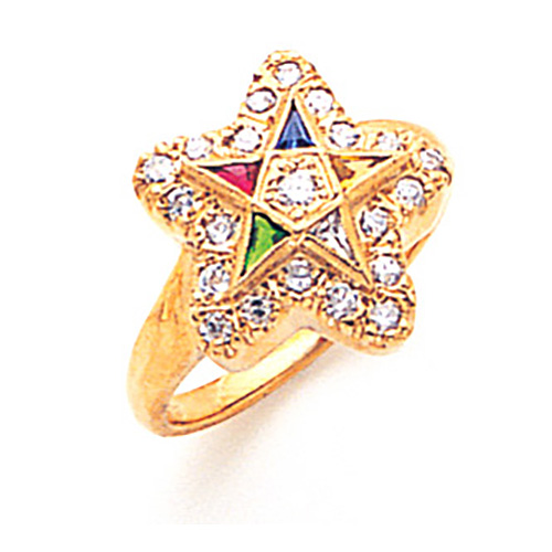 This diamond Order of the Eastern Star ring is made of polished 14k yellow gold. Finely detailed ring features simulated stones in each point of the Order of the Eastern Star logo. Diamond details: 1/2 CT TW, 20 x .02 CT round full cut diamonds surround 1 x .08 CT center stone. Open back. Made in the USA.