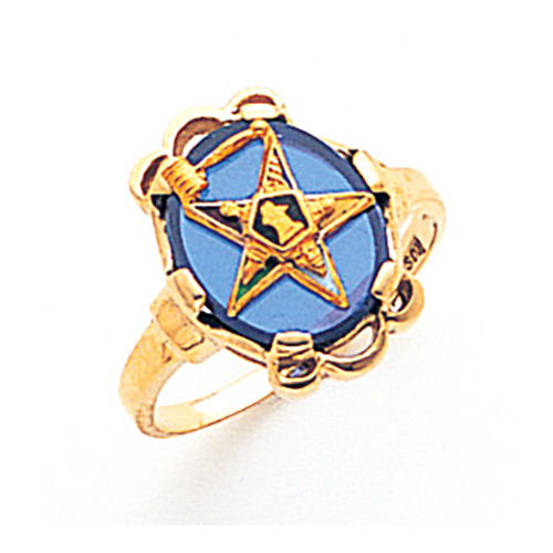 This Order of the Eastern Star past matron ring has an oval blue stone and is made of 14k yellow gold. Ring features multi-colored enamel Order of the Eastern Star logo and secure six prong setting. Made in USA.