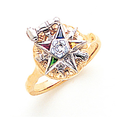 This Order of the Eastern Star past matron ring has a round signet style top and is made of polished 10k yellow gold. Finely detailed ring features a gavel and enameled Order of the Eastern Star logo with five implements between the points. Made in USA.
