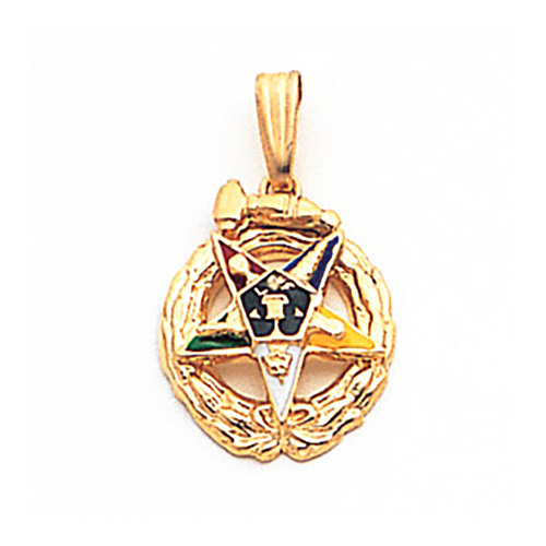 Polished 10k yellow gold. Pendant is 5/8 inch tall and 1/2 inch wide. This item features a gavel and multi-colored enamel Order of the Eastern Star logo.