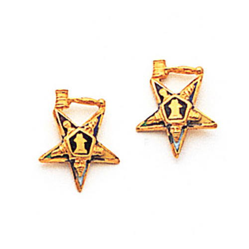 Polished 14k yellow gold, friction backs. Each earring is 7/16 inch tall and 3/8 inch wide. Multi-colored enamel Order of the Eastern Star logo.