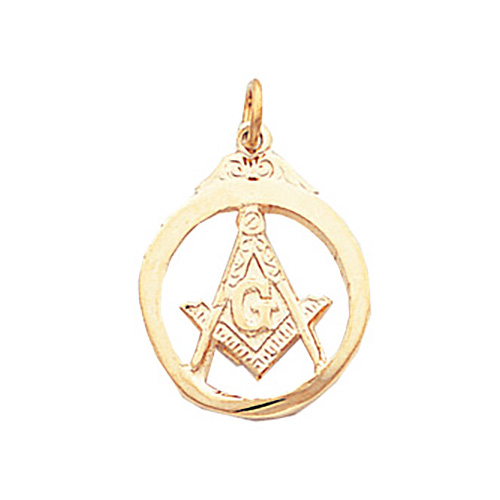 This round 10k yellow gold masonic pendant has a cut-out design. Item measures 3/4 inch tall and 3/4 inch wide. Fits up to a 3mm wide chain. Made in USA.