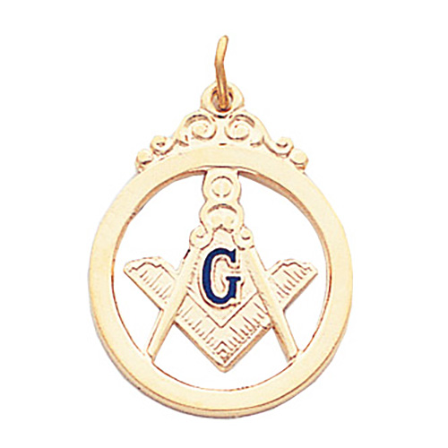 This round 10k yellow gold masonic pendant has a cut-out design. Item measures 7/8 inch tall and 7/8 inch wide. Chain sold separately. Jump ring fits up to a 3mm wide chain. Made in USA.