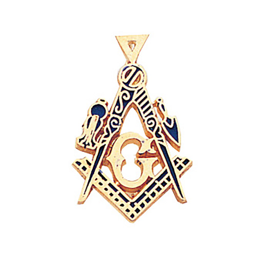Polished 14k yellow gold. Blue enamel with Masonic logo. Item measures 1 inch tall and 5/8 inch wide. Chain sold separately.